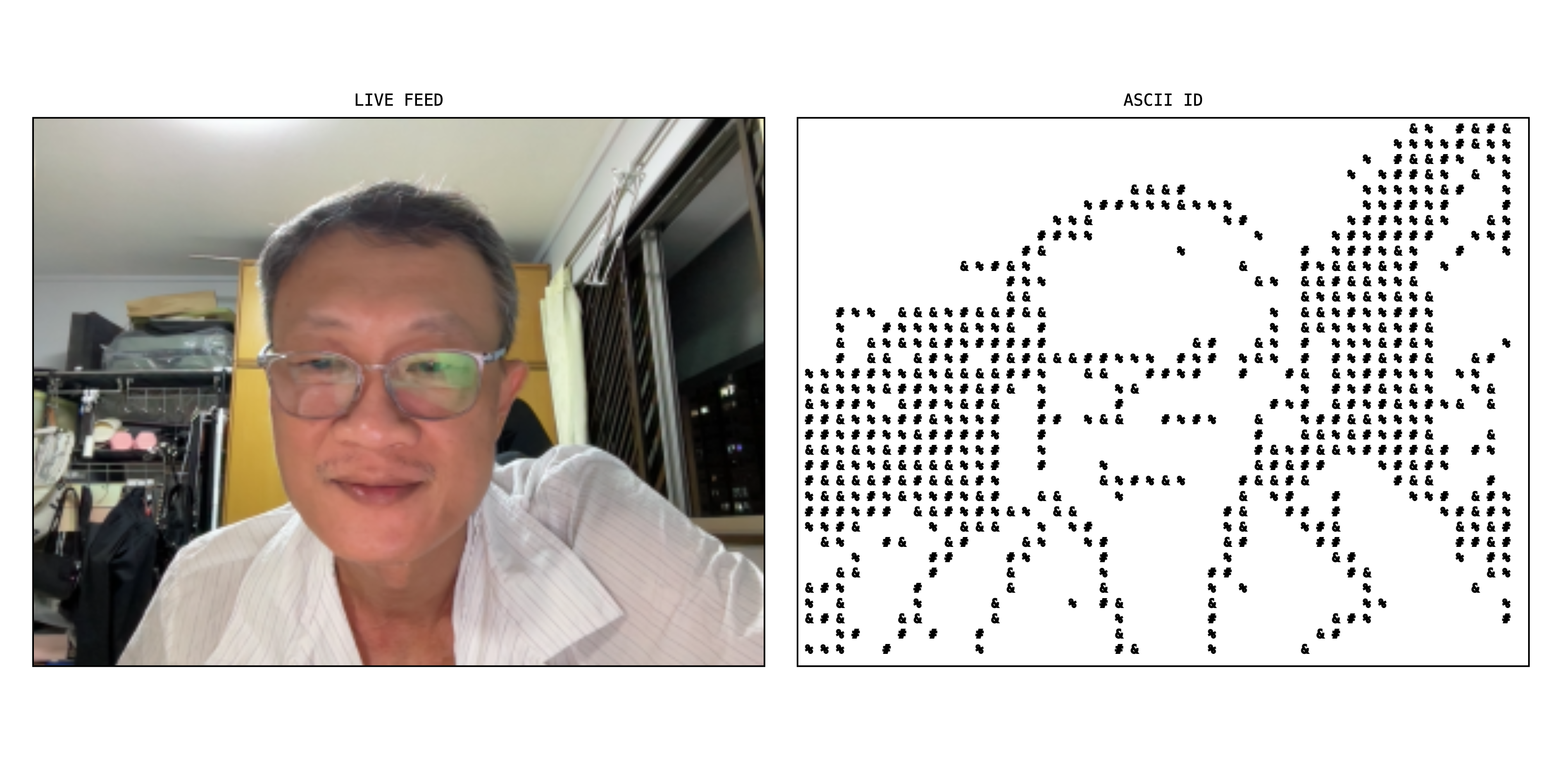 The live camera captures the user’s silhouette and reconstructs it as a mosaic made solely from those characters. Displayed beside the real-time reflection, the ASCII version reveals how algorithms compress rich human presence into narrow, predefined vocabularies, showing how our digital selves are continuously shaped, limited, and reassembled from the traces we leave behind.