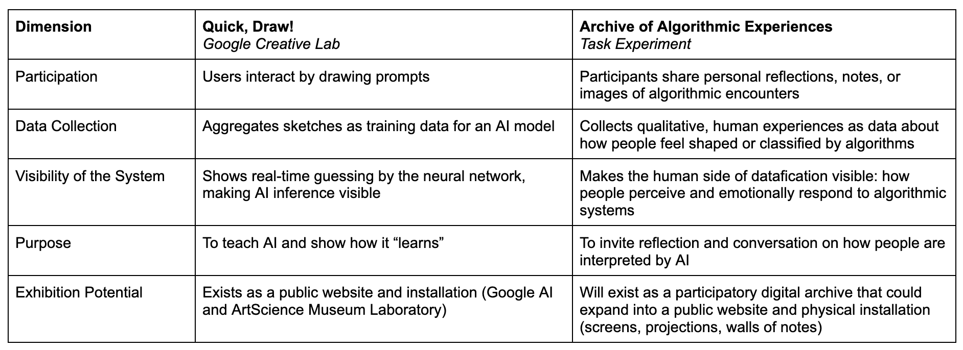 Google's Quick, Draw! stood out to me. Watching my sketches being instantly interpreted by an AI made the invisible computational process visible in a playful yet experimental way. I asked myself, if such drawings can show how machines interpret humans, could I reverse that process to expose how human experience is being interpreted by machines?