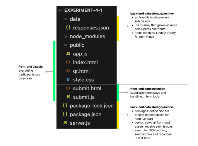 In one of CiD's workshops, we learnt about Node.js. Since my experiment collects responses from participants and immediately displays them on the live wall, I needed a backend that is fast, lightweight, and easy to prototype. It allows the entire process to communicate seamlessly in real time.