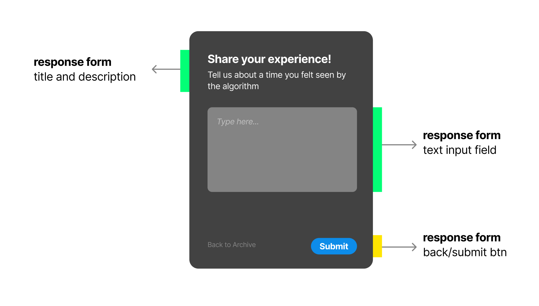 At the bottom of the screen, two options are provided: a “Back to Archive” button that returns them to the collective display, and a “Submit” button that instantly sends their reflection into the growing archive. This flow ensures that participants can contribute seamlessly while maintaining a clear sense of where their input goes and how it becomes part of the shared experience.