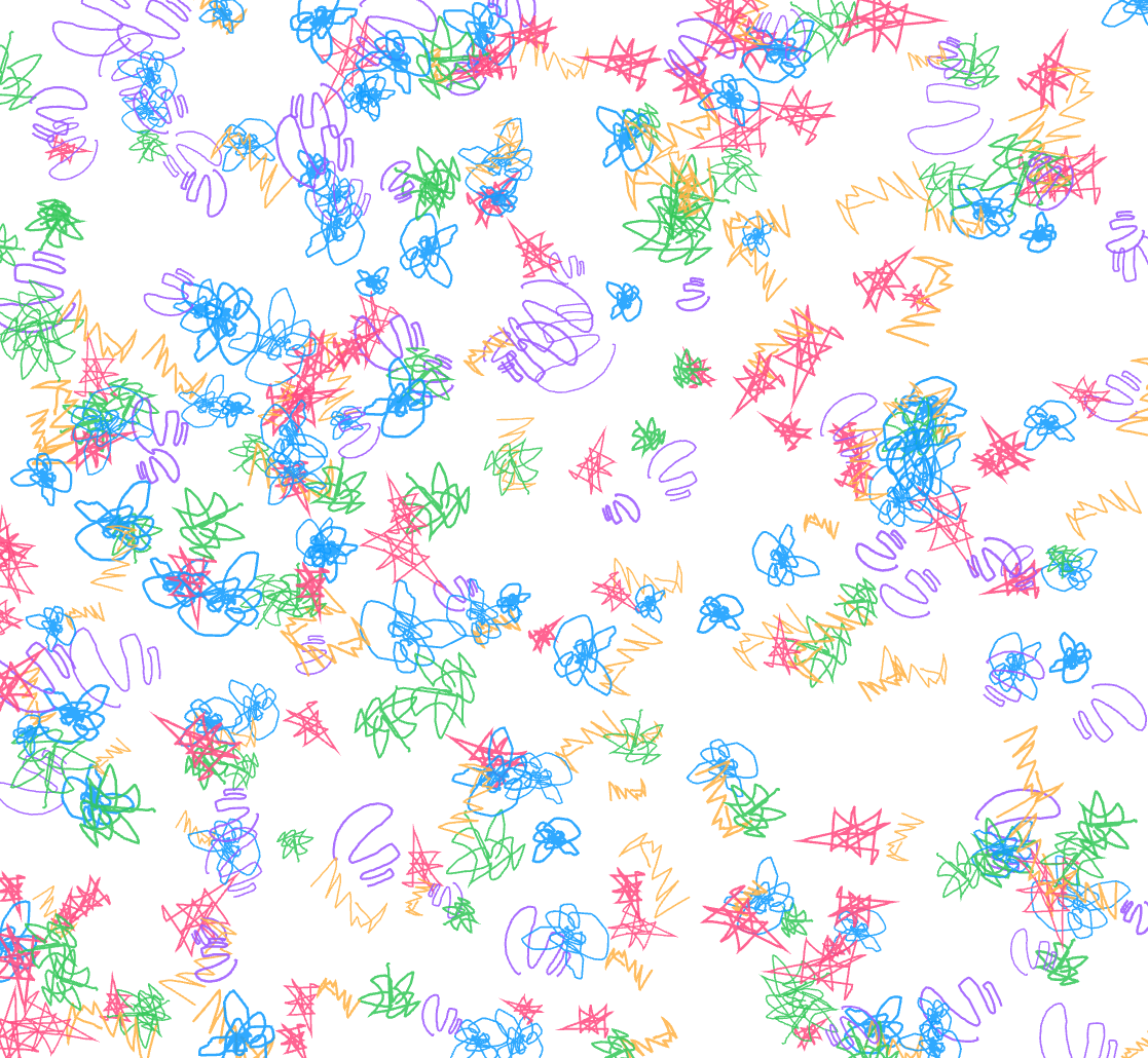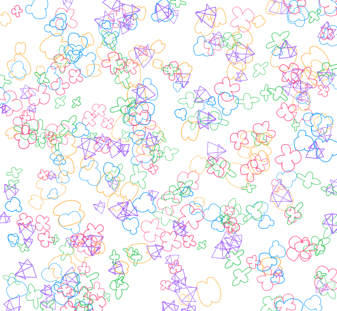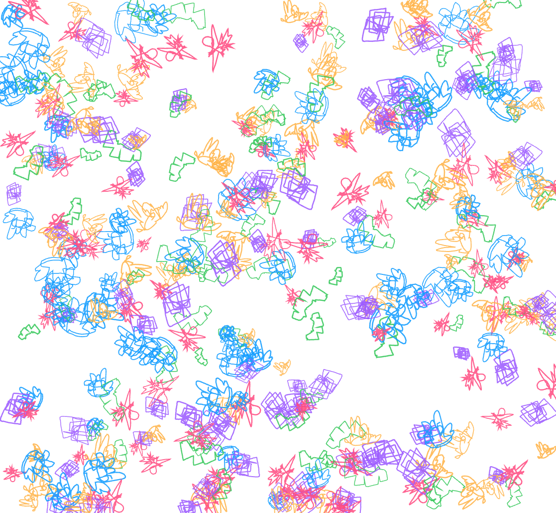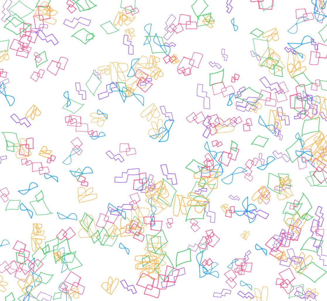In the early stages of this prototype, the system simply populated the entire screen with the user’s five drawings once all shapes were completed. Visually, it was engaging, but conceptually it fell short. It showed repetition, not reduction. Nothing about that sequence revealed the core idea I was trying to explore: how human gestures are progressively stripped of meaning as they pass through computational processes.