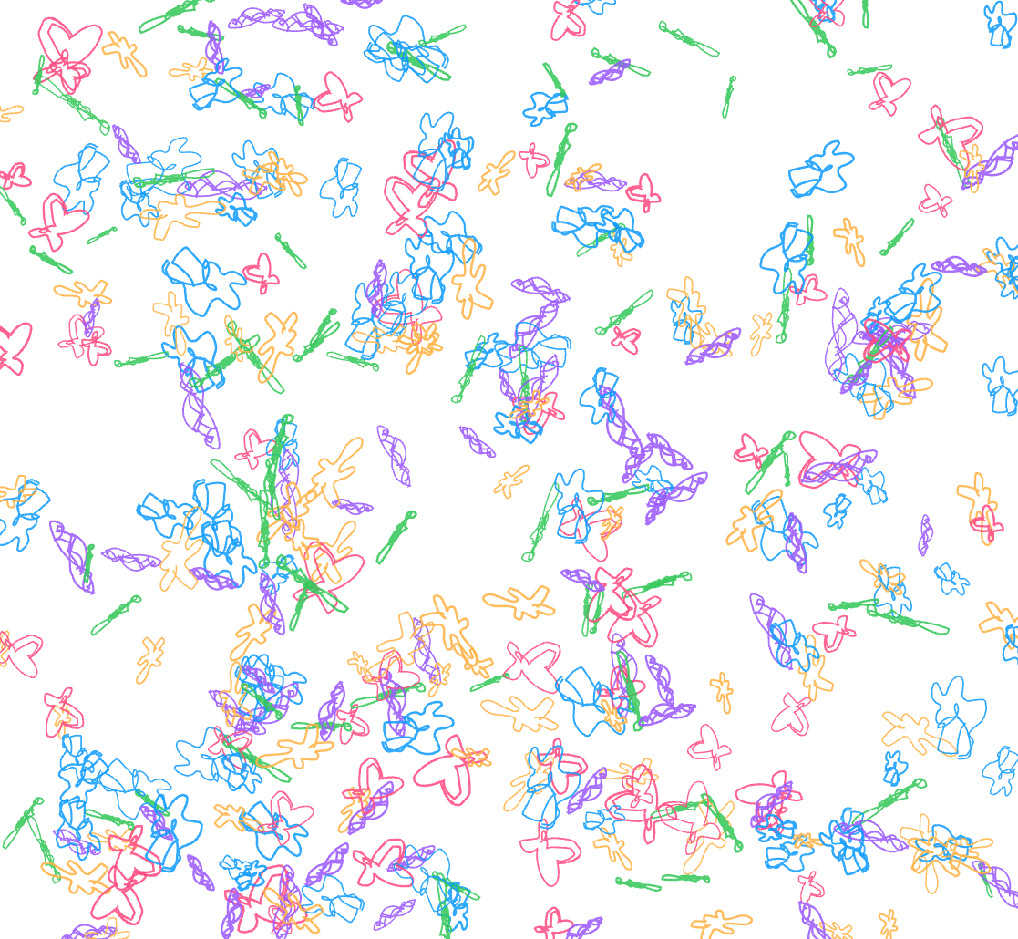 ⑴ Replay of All Five Shapes: Sketches reappear in scattered positions, showing how expressive marks become reproducible behavioural traces.