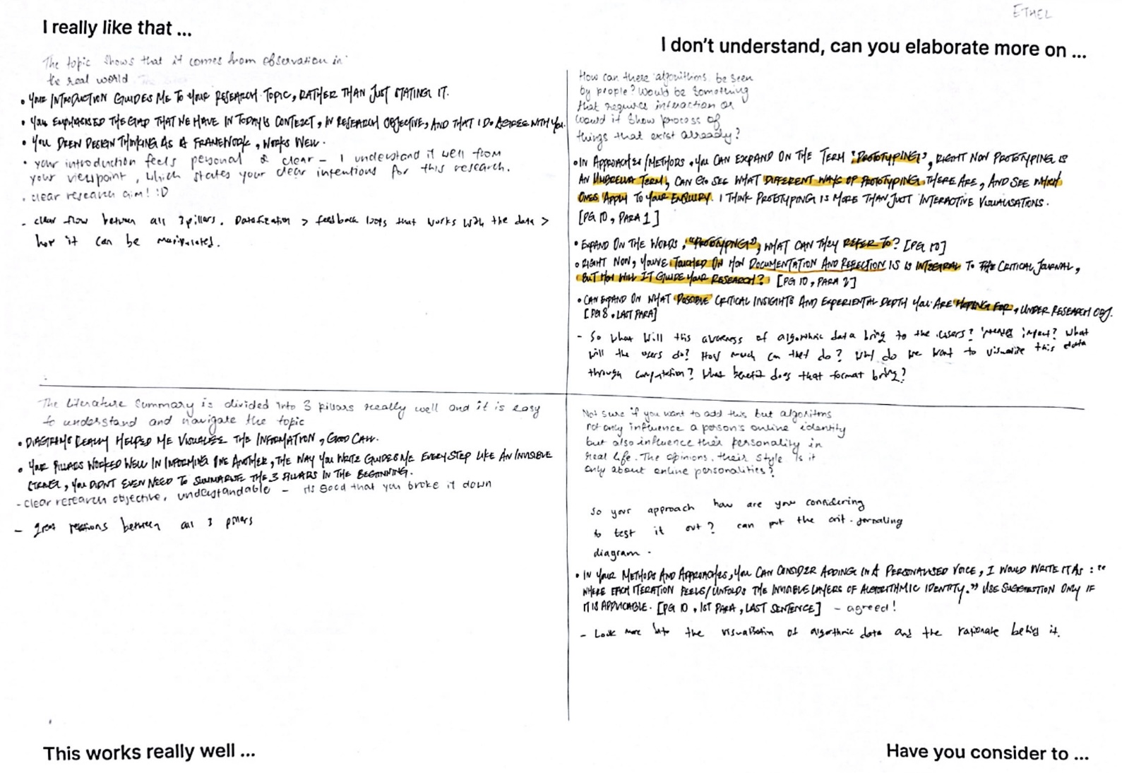 Reflecting on the peer feedback, I can see that my RPO has a strong foundation in its clarity, structure, and the way the three pillars flow into one another. The feedback highlighted that the introduction, use of diagrams, and design thinking framework are working well to guide readers, which reassures me that the direction is clear and engaging. At the same time, the comments point to important areas that need further depth, particularly around methods, prototyping, and the rationale behind visualising algorithmic identity.