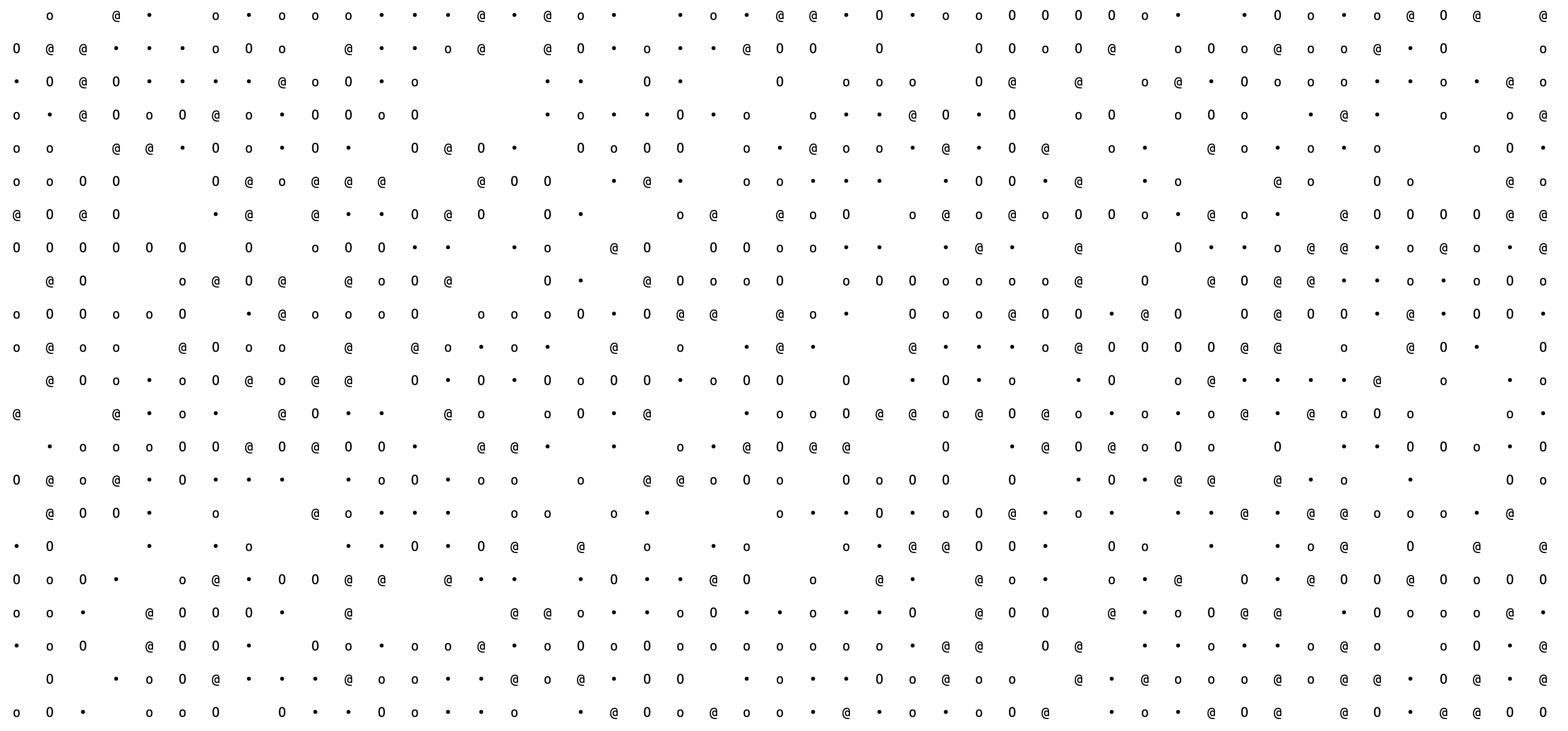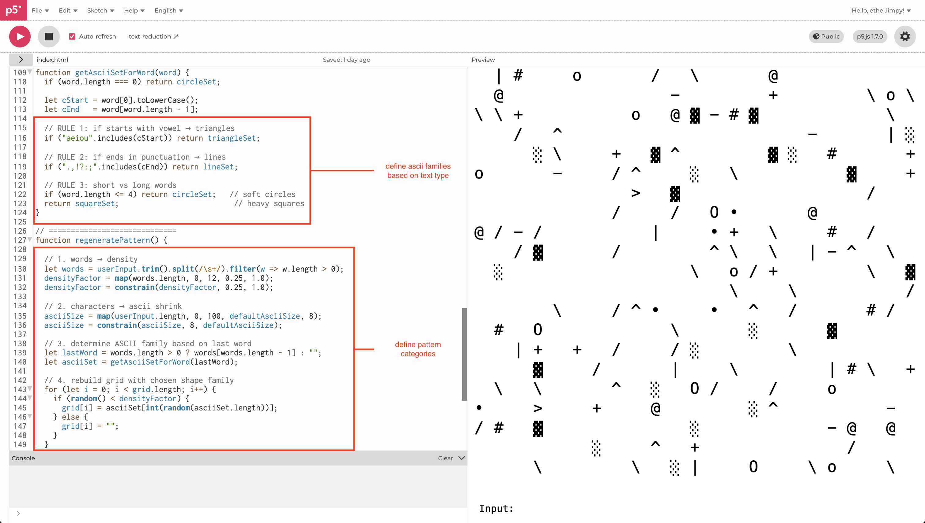 I assigned rules to each of the ASCII shape families to classify each word based on length, vowel beginnings, or punctuation endings. From there, I seeked ChatGPT's help to create a dynamic grid that regenerates based on what the user types. The density of the grid increases as more words are entered, while the ASCII size shrinks as input grows, making the visual feel increasingly compressed like the process of reduction. The key function (getAsciiSetForWord) determines which ASCII family the system will use. With ChatGPT's help I managed to make regeneratePattern() rebuild the entire field of characters each time, ensuring that the grid visually reflects the user's input. Through these rules, the technical process reenacts the computational reduction that inspired the experiment.