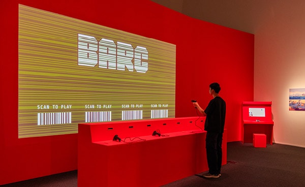 BARC is a multiplayer arcade shooter game where players must scan barcodes in both the virtual and physical world to complete different objectives. Players take on the role of a warehouse employee equipped with a magical barcode scanner. Game tasks are delivered to the player via a receipt printer in the real world, and players must manage the onslaught of virtual agents and torrent of physical receipts to complete their shift It invites collaboration and playful resistance to standard game mechanics.