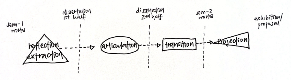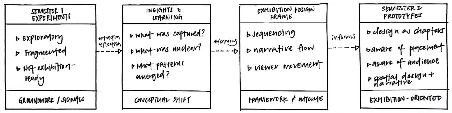 Given the limited timeframe, the dissertation now functions less as documentation of a completed exhibition and more as a process of planning and articulation. The first half focuses on conceptualising the exhibition framework, while the second half addresses how this framework might take shape through design. Rather than attempting to resolve all transitions, the emphasis is on developing one new prototype in Semester 2 as a transition piece, positioned alongside Semester 1 works to signal this shift. The discussion section therefore looks both backward and forward: reflecting on how earlier experiments inform future making, and outlining how these learnings lead towards an exhibition proposal