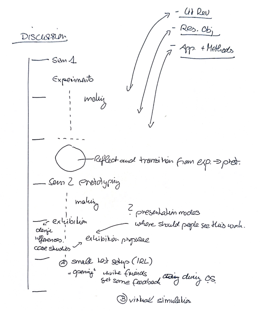 As I moved forward with the dissertation, I questioned whether the exhibition proposal should be included within it. Through discussion, Andreas clarified that the discussion section should function as a structured progression, rather than a static reflection. It begines with Semester 1 experiments, followed by a reflective transtion from experimentation to prototyping, before moving into Semester 2's prototyping.