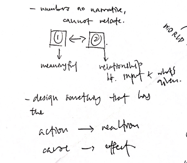 Physical Prototype 1 is currently too overly illustrative and it lacks a meaningful relationship between input and output. The numbers used for the output exist, but they do not mean anything to the user. Users cannot tell why the number appears, they cannot link their action to the system's response, and there is no narrative hook.