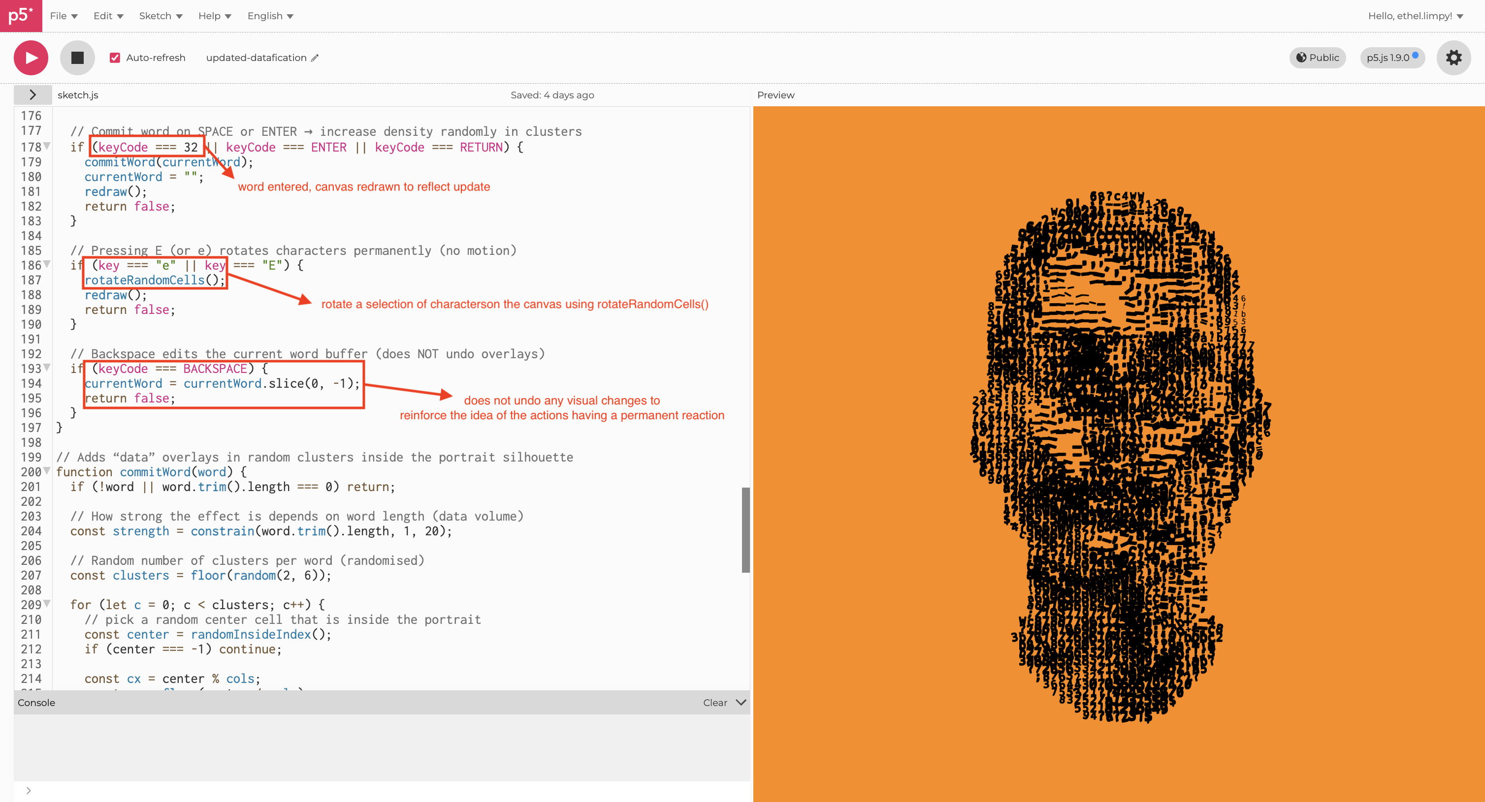 I set the rule where each committed word becomes a data event that is incrementally thickening, enlarging, or distorting clusters of characters within the silhouette. The system only records data when it is submitted using the space or enter button. Rotation is triggered by pressing a single key "E".