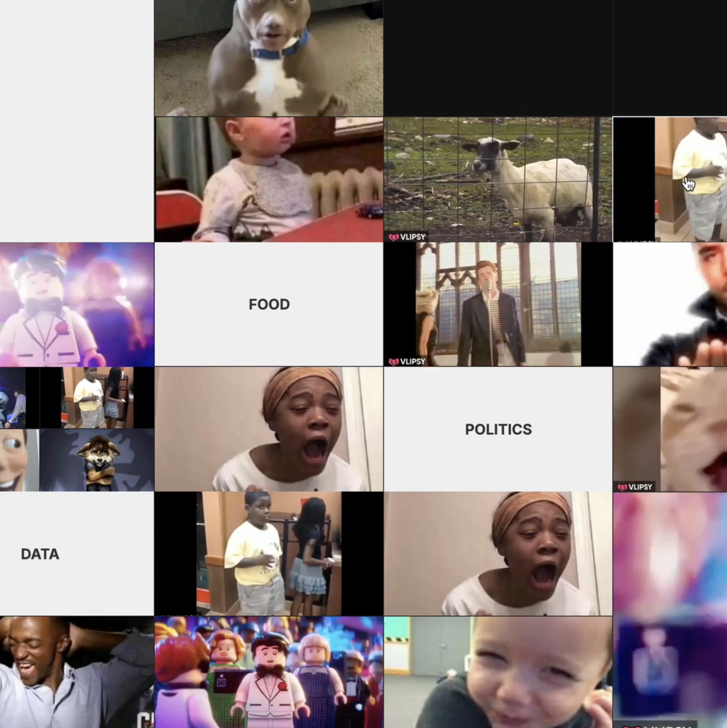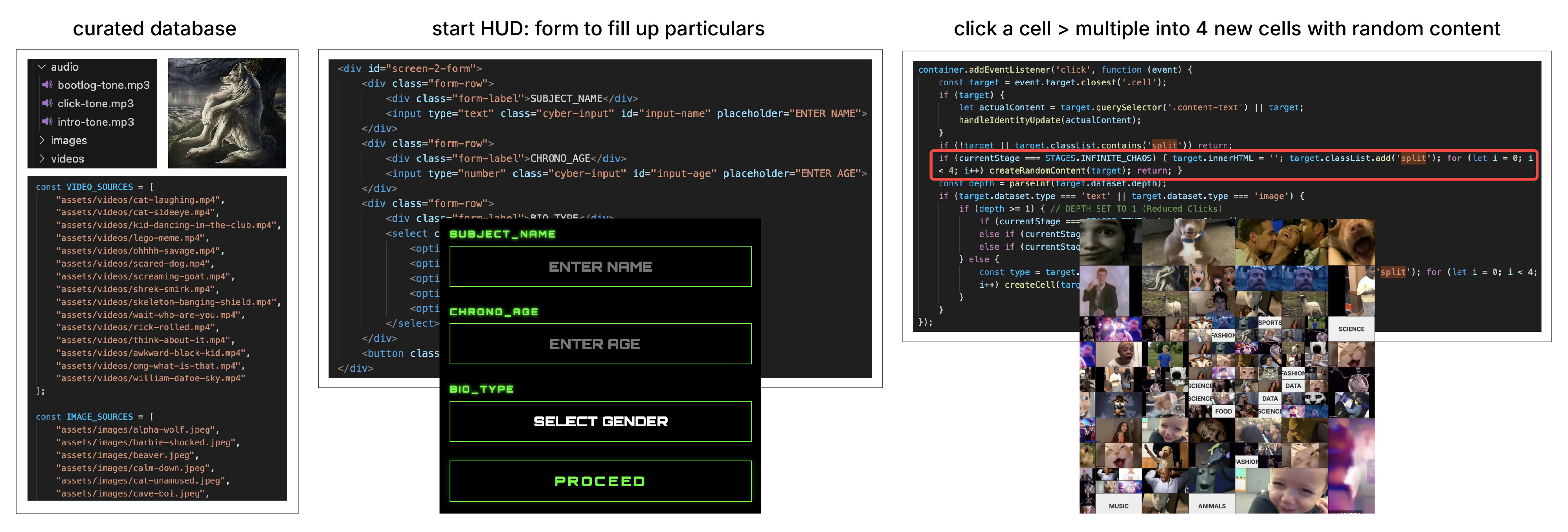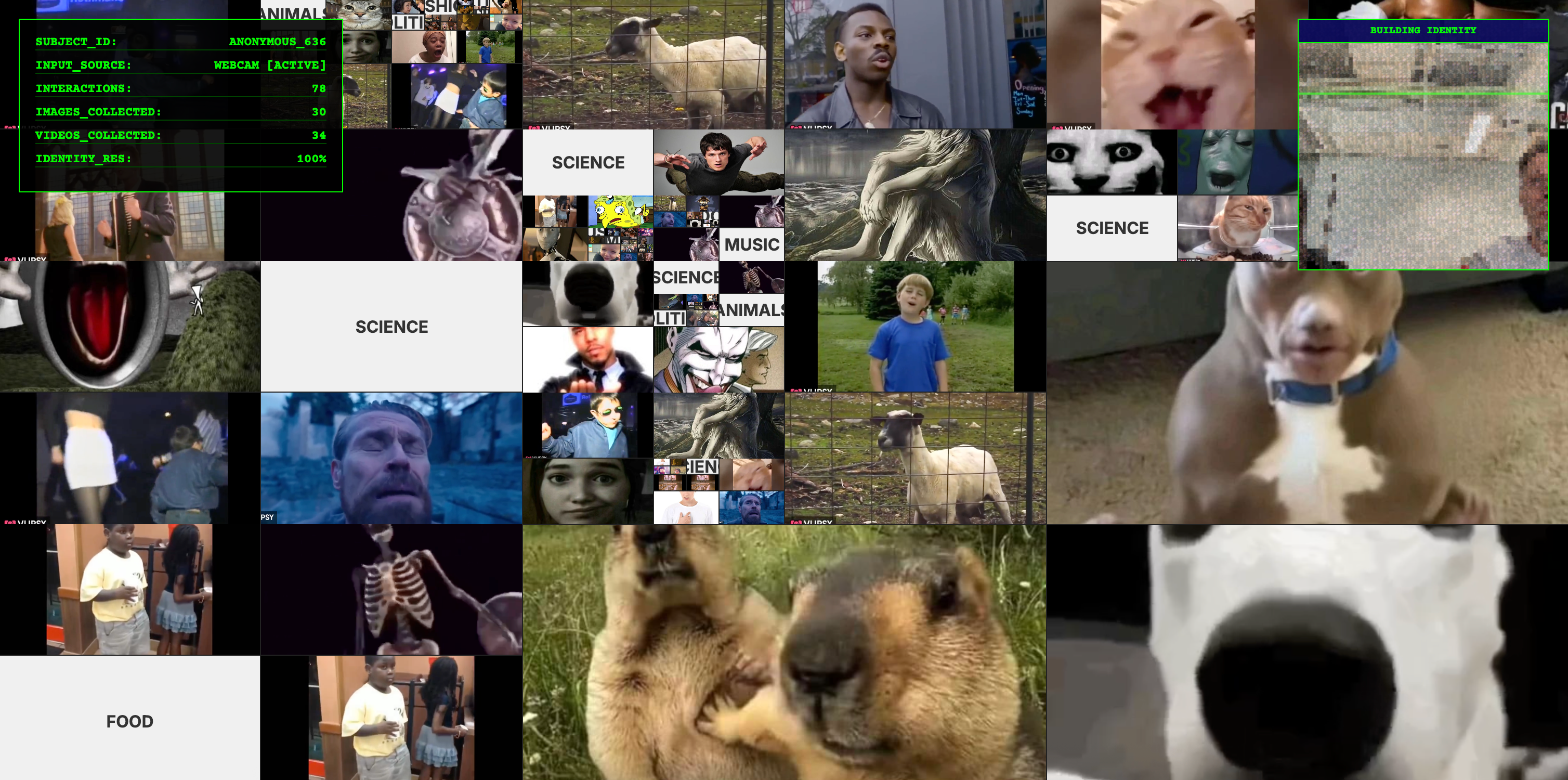 Once it starts, every click triggers a new state. The interface multiples, splits, and floods the screen with more randomised meme content. The interaction escalates quickly, simulating how platforms reward engagement with constant novelty and volume. As the user keeps clicking, the system quietly collects what they choose and then recomposes these into an identity portrait. The final output turns mindless consumption into visible inference: an "algorithmic identity" of the user built from nothing but the content they couldn't stop interacting with.