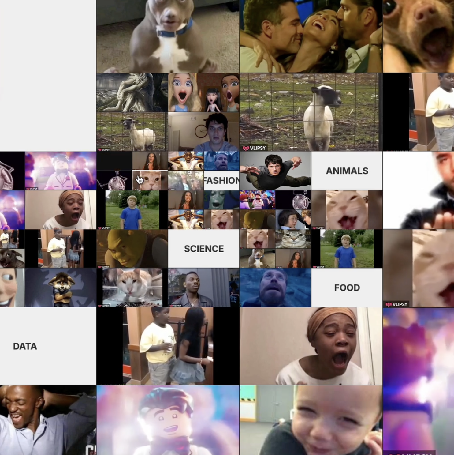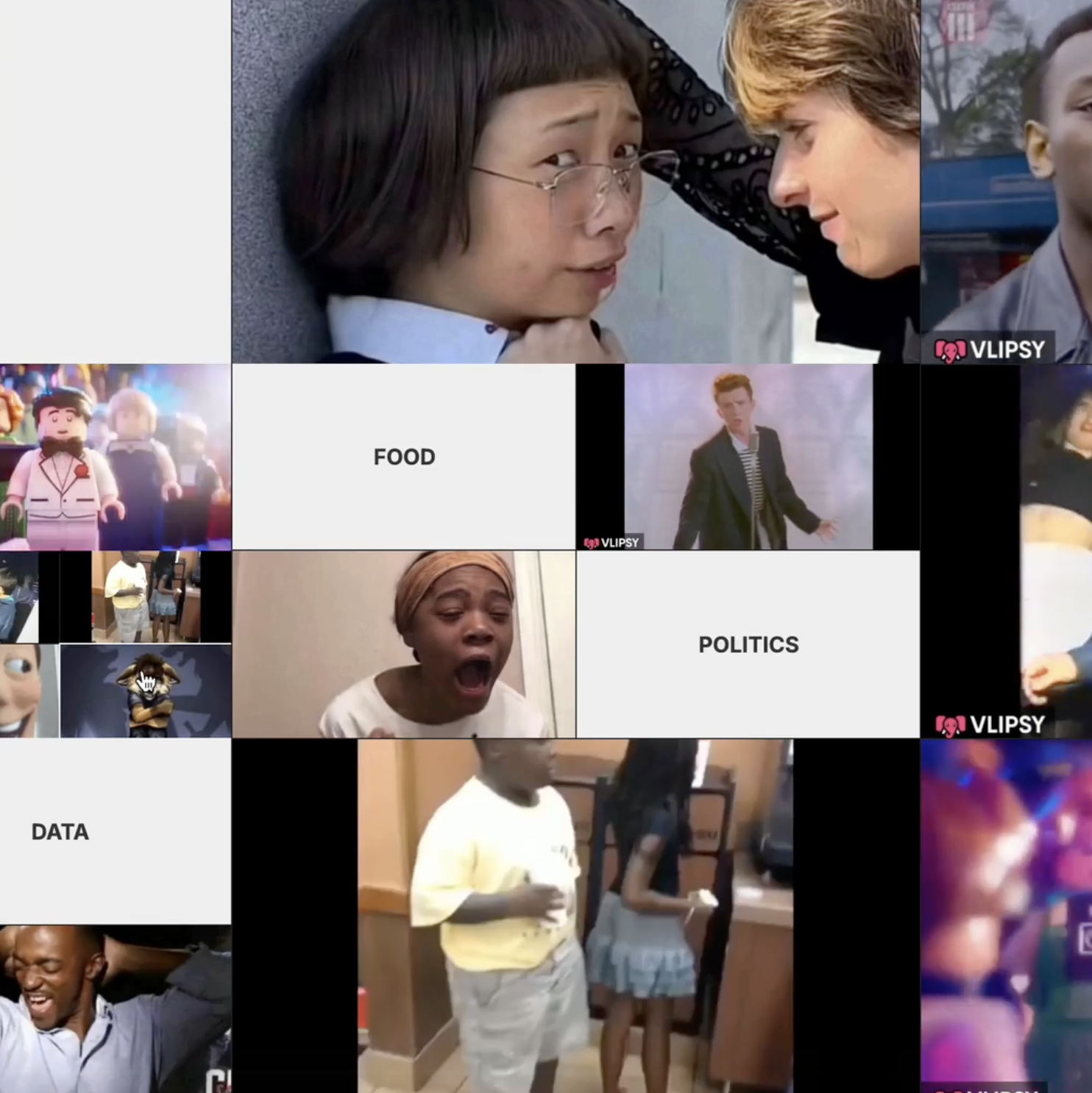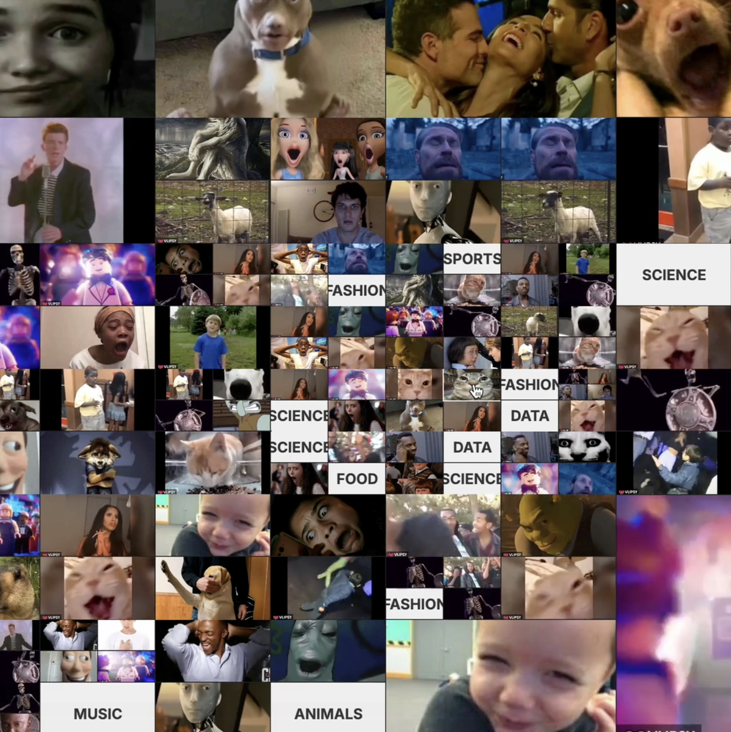 Once it starts, every click triggers a new state. The interface multiples, splits, and floods the screen with more randomised meme content. The interaction escalates quickly, simulating how platforms reward engagement with constant novelty and volume. As the user keeps clicking, the system quietly collects what they choose and then recomposes these into an identity portrait. The final output turns mindless consumption into visible inference: an "algorithmic identity" of the user built from nothing but the content they couldn't stop interacting with.