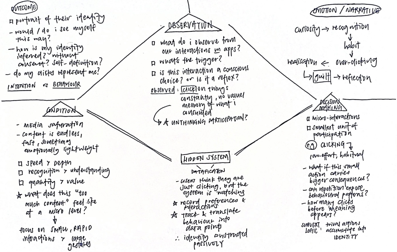 Rather than abstract clicks, the experience could begin with more relatable entry points such as food, culture, politics etc. using curated datasets (e.g. top trending foods or dominant political narratives) to help audience see themselves more clearly in the system. Using real or semi-real data would allow users to react emotionally and critically to their own patterns, rather than treating the interaction as playful noise.