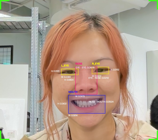 Prototype 6: Face Value confronts the first threshold of the exhibit: Biometric Data. It makes visible the technical process behind biometric capture. As participants stand before the camera, their faces are not interpreted as expressions, but decomposed into measurable landmarks such as eyes, nose, mouth. Each translated into coordinate points and bounding boxes. What appears on the screen is not simply a facial overlay. It is a computational breakdown of detection → landmark mapping → value extraction → categorisation.